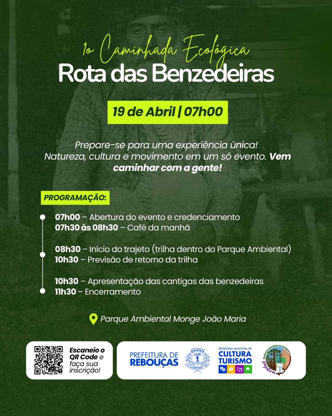 A Prefeitura de Rebouças, por meio da Secretaria Municipal de Cultura e Turismo, promove no próximo dia 19 de abril, a partir das 07h00, a 1ª Caminhada Ecológica – Rota das Benzedeiras, no Parque Ambiental Monge João Maria.